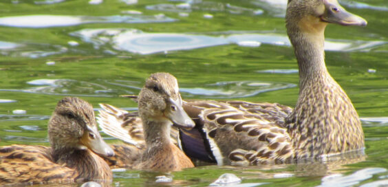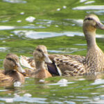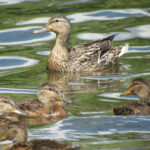 An “expectant” mother mallard must first incubate her eggs for between 26-30 days. Once the downy ducklings hatch – sometimes 8, 9, or even a dozen! — she stays with them and keeps them warm. Mama Mallard then leads her babies to safer areas and shows them where to find food. She stops periodically to ensure her babies are keeping up. Mama is also extremely wary, always on the lookout for predators, as lots of other animals will try to eat ducklings including foxes, skunks, snakes, snapping turtles, and large fish. She does her best to defend them and may even feign an injury to lure a predator away from her vulnerable babies.