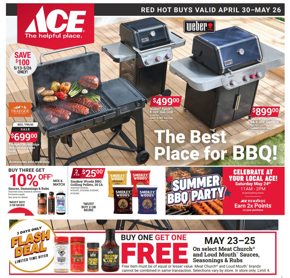 Grilling season is here and Tully Lakes Ace Hardware is your place for the best brands in barbecue! We carry a big selection of grills from Weber, Traeger, Blackstone and more, plus all the fuel and accessories you need and great bonus deals for Ace Rewards members. If you’re thinking of replacing an old grill or just wanted to expand your outdoor cooking with a smoker or pizza oven- stop by the grill department to see the expansive selection of options and newest technology in outdoor barbecue. Or even better, see some grills in action and taste the possibilities at one of Nightingale’s BBQ Demo days!
