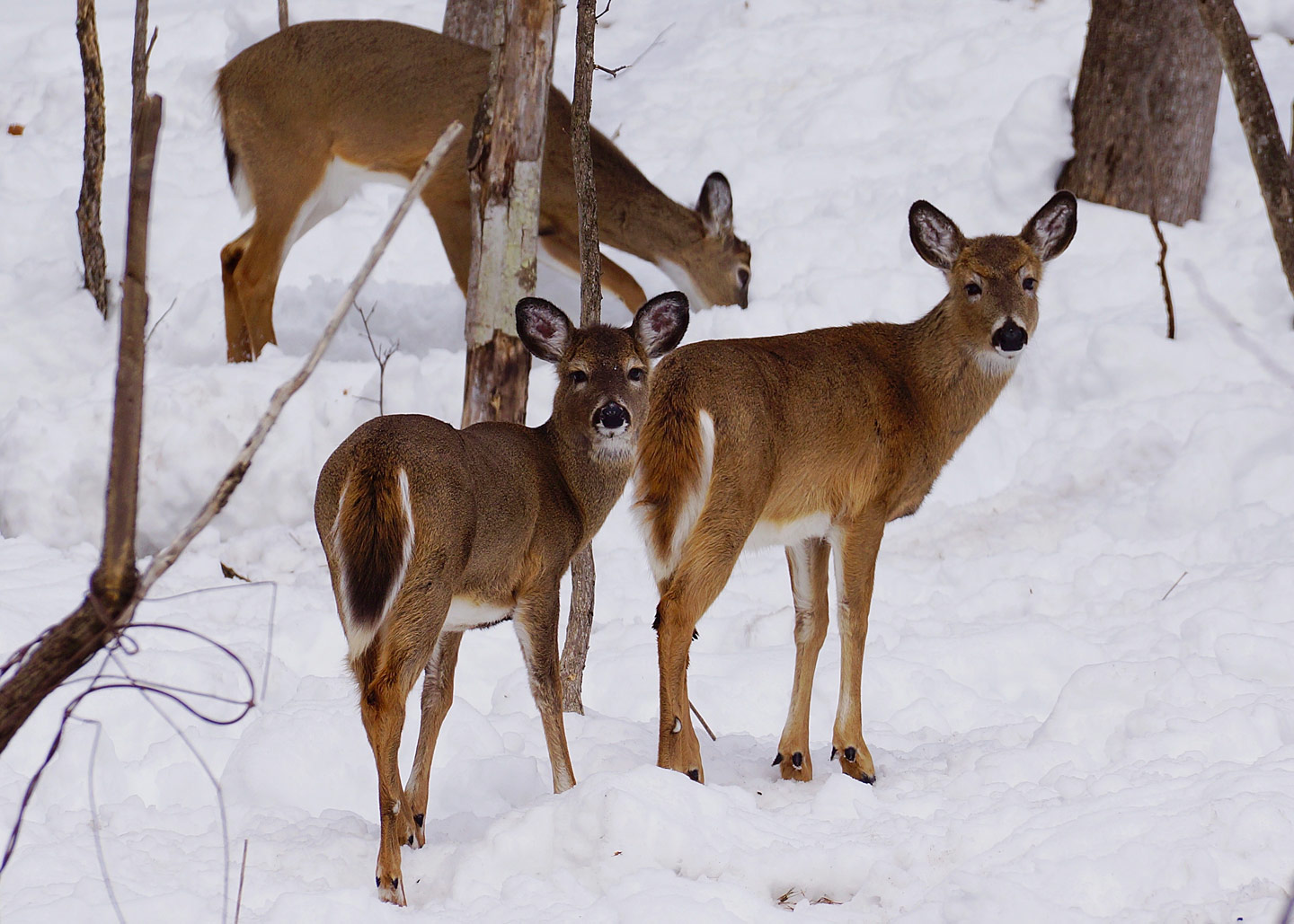 Other survival adaptations and seasonal strategies in deer include a slower winter metabolism and a decrease in activity. When on the move, deer prefer to use the same well-packed trails to conserve energy. They also seek out sheltered places (called “deer yards”), where thick evergreens help buffer the wind and filter snow.